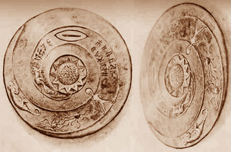 Discurile aveau diametre de cca. 30 cm, 85 mm grosime, având fiecare cioplită câte o deschidere centrală, fie de formă circulară, fie dreptunghiulară. Mai important este faptul că majoritatea aveau o pereche de ghinturi minuscule de formă spiralată, gravate cu caractere stranii, pornind din exteriorul discului, de la margini spre centru.