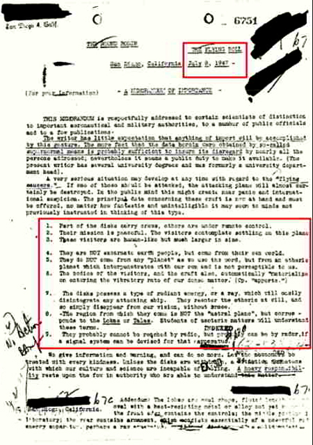 « Ce mémorandum est destiné respectueusement à l’intention d’éminents scientifiques renommés, à d’importantes autorités militaires et dans l’aéronautique, à un certain nombre d’agents des services publics et à quelques personnalités concernées. L’écrivain a peu d’espoir que tout ce qui importe sera accompli par ce geste. Le simple fait que les données ci-après aient été obtenues par des moyens dits supra-normaux suffisent probablement à ce que la quasi-totalité des personnes adressées en fassent abstraction ; néanmoins, elles ont décidé de rendre l’information publique. (Le présent écrivain a plusieurs diplômes universitaires et était autrefois le doyen de sa filial à l’université).