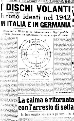 Prima referire certă la OZN-urile naziste provine dintr-o serie de texte scrise de Giuseppe Belluzzo, expert italian în turbine, care spus că: „o mare putere lansează aceste discuri zburătoare pentru a le studia”. Un astfel de text care detaliază tehnologiile secrete a fost publicat în 24 martie 1950 de cotidianul italian „Il Giornale d’Italia”: „… tipurile de discuri zburătoare au fost proiectate și studiate în Germania și Italia încă din 1942”.