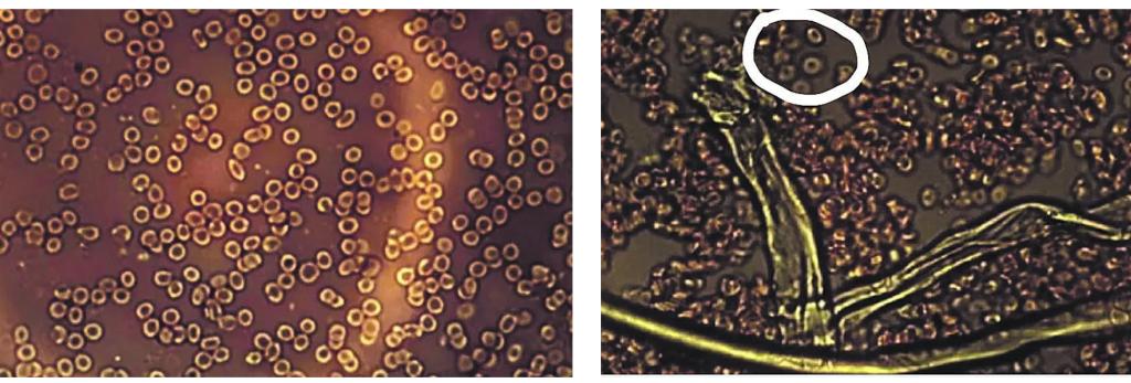 Mai jos este o imagine cu celule roșii sănătoase din sânge văzute la un microscop – așa ar fi necesar să arate sângele. Nu există semne de coagulare sau obiecte străine în el. În sângele sănătos, celulele sunt capabile să se miște separat; au motilitate bună și nu vor provoca tromboză.