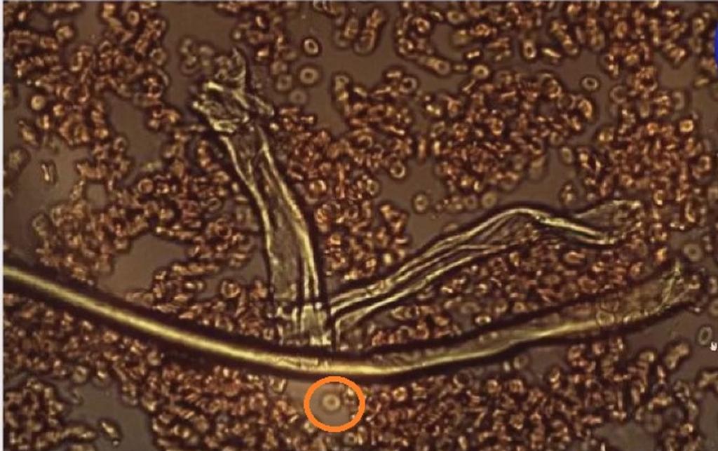 Următoarea imagine este cu sângele unei persoane care a fost injectată cu medicamentul experimental anti-covid. Sângele este coagulat, globulele roșii deformate sunt aglomerate. Celula încercuită în imagine este o globulă roșie sănătoasă, una dintre puținele din imagine, așezată alături de fibrele de grafen. Puteți vedea dimensiunea fibrelor de grafen în raport cu dimensiunea unei celule roșii din sânge. Fibrele de această dimensiune vor bloca capilarele. De asemenea, puteți vedea că fibrele de grafen sunt tubulare și conțin globule roșii.
