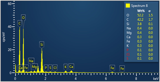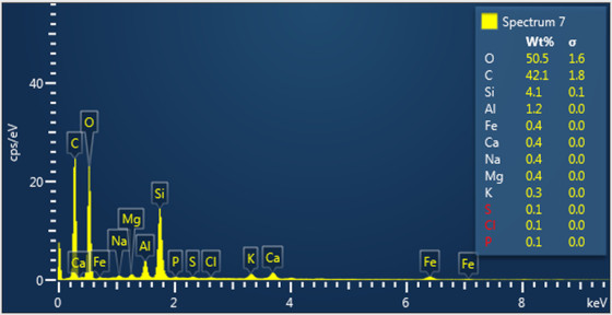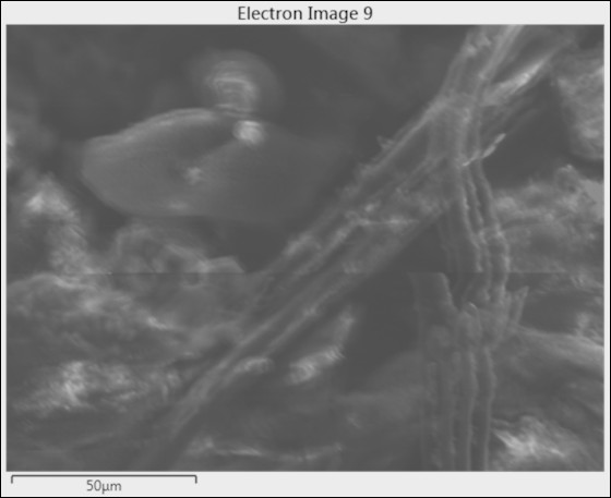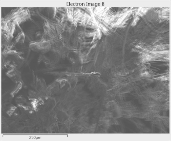 - Praful din 26 și 27 aprilie a avut aspect fibros, cu fibre netede de diferite grosimi si lungimi, prea încărcate electrostatic pentru a putea fi obținută o imagine decentă la scanare. La examinare cu raze x, elementele identificate au fost următoarele: oxigen, carbon, siliciu, aluminiu, sodiu, calciu, fier, magneziu, potasiu și cantități mai mici de fosfor, sulf, clor, titan.