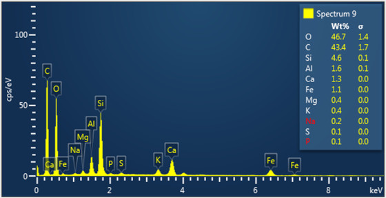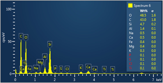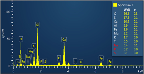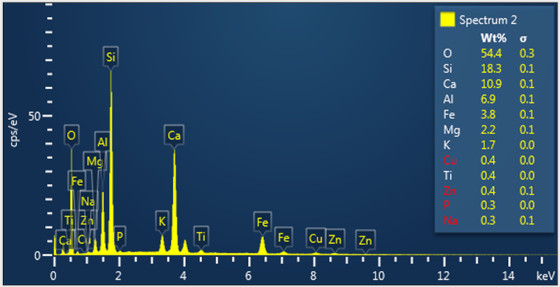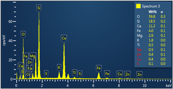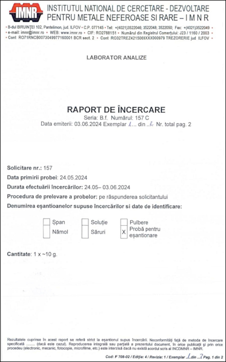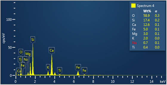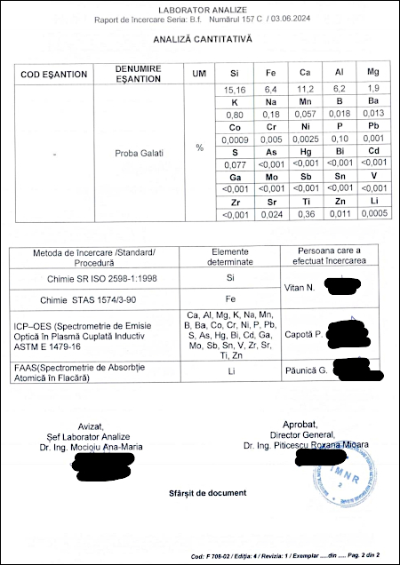 Analiza a fost realizată la Institutul Național de Cercetare-Dezvoltare pentru Metale Neferoase și Rare IMNR. S-a efectuat o analiză cantitativă cu exprimare procentuală a metalelor: siliciu 15,16%, fier 6,4%, calciu 11,2%, aluminiu 6,2%, magneziu 1,9%, potasiu 0,8%, sodiu 0,18%, mangan 0,057%, bor 0,018%, bariu 0,013%, cobalt 0,0009%, crom 0,005%, nichel 0,0025%, fosfor 0,1%, plumb 0,001%, arsen <0,001%, mercur <0,001%, bismut 0,001%, cadmiu <0,001%, galiu <0,001%, molibden <0,001%, stibiu (antimoniu) <0,001%, staniu <0,001%, vanadiu <0,001%, zirconiu <0,001%, stronțiu 0,024%, titan 0,36%, zinc 0,011%, litiu 0,0005%.