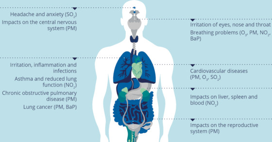 Alături de aluminiu, și alte metale detectate în exces în așa-zisul praf saharian sunt toxice, așa cum se poate constata din raportul din 2010 al Agenției de Protecție a Mediului din Statele Unite „Overview of Airborne Metals Regulations, Exposure Limits, Health Effects, and Contemporary Research” – „Prezentare generală a reglementărilor privind metalele din aer, limitele de expunere, efectele asupra sănătății și cercetarea contemporană” (https://www3.epa.gov/ttnemc01/prelim/otm31appC.pdf), document foarte valoros pentru cei care vor să aprofundeze efectele toxice ale anumitor metale. Din păcate, acest tip de toxicitate este foarte puțin studiat în facultățile de medicină. Acești factori etiologici sunt ignorați, deși există o multitudine de boli considerate ca având cauză neprecizată, inclusiv cancere. Aceste particule pot determina efecte nefaste prin acțiune directă (inclusiv cu afectarea ADN-ului), dar și indirectă – prin generare de radicali liberi. De asemenea, un alt mecanism de toxicitate și generare de boli, în special autoimune, este efectul corona al nanoparticulelor (https://pubmed.ncbi.nlm.nih.gov/38442162/). Pătrunderea lor în organism se face în funcție de mărimea, dar și de tipul lor. Particulele foarte mici PM2.5 pot traversa bariera pulmonară și pătrund în circulație sau pot ajunge din nas, pe calea nervilor olfactivi direct in creier. Agenția Europeană de Mediu (https://www.eea.europa.eu/themes/air/health-impacts-of-air-pollution) afirmă că, în 2019, 307.000 de decese premature în UE au fost cauzate de particulele sub 2,5 microni – PM2.5. Aceste particule pot determina diverse afecțiuni ce sunt evidențiate în figura de mai jos. (Sursă: EEA, „Healthy environment, healthy lives”, 2019 (https://www.eea.europa.eu/publications/healthy-environment-healthy-lives)