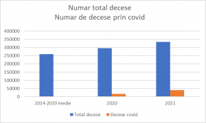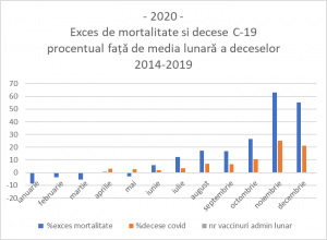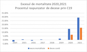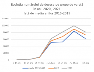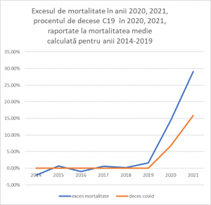 1. În anii 2020 şi 2021 a existat un exces important de mortalitate față de media mortalității în anii 2014-2019, și anume de 14,44% în 2020 și respectiv de 29,14% în 2021 (Figura 1).