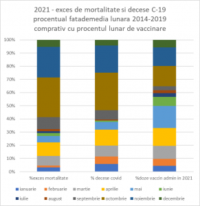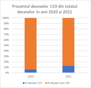3. Se poate observa că decesele C19, chiar şi supraestimate, au reprezentat o cauză minoră de deces în cadrul mortalității totale în anii 2020 şi 2021. Astfel, în anul 2020 decesele prin C19 au reprezentat 5,91% din totalitatea deceselor, iar în 2021 acestea au fost responsabile, în mod surprinzător, de 12,27% din totalitatea deceselor (figurile 3, 4). Dacă măsurile luate de guvernanți ar fi funcționat, ar fi fost logic ca numărul de decese prin C19 să scadă în 2021 față de 2020. Este deci evident că măsurile neștiințifice impuse de OMS , UE, adoptate fără simț critic şi fără adaptare la condițiile României – limitarea activității în spitale și ambulatorii, în diferite ramuri de activitate, distanțarea, purtarea măștii și mai ales injectarea cu terapii genice experimentale, promovate agresiv, mincinos – au fost nu doar ineficiente, ci nocive.