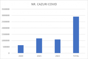 10. Dacă măsurile luate de autorități ar fi fost eficiente, numărul de cazuri C19 raportate ar fi fost firesc să fie în scădere. Însă, din figura 13 vedem exact contrariul. În ciuda măsurilor impuse de distanțare, purtare a măștii, reducere a activității în spitale, cazurile au crescut constant în 2020. Vaccinarea, în loc să fi contribuit la scăderea numărului de cazuri, pare să fi avut un efect stimulator, panta curbei cazurilor declarate fiind mai mare în 2021 față de 2020 și încă și mai accentuată în 2022 față de 2021, așa cum se poate observa din curba cazurilor C19 afișată pe pagina https://www.worldometers.info/coronavirus/country/romania/ (figura 13). În figura 14 am exprimat grafic evoluția numărului de cazuri pe ani, raportarea în 2022 fiind până pe 20 mai (pe mai puţin de 6 luni).