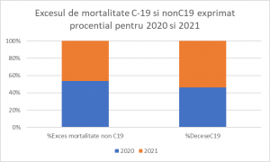 2. Excesul de mortalitate din acești doi ani (față de media deceselor în anii 2014-2019) este datorat covid-19 (C19) într-un procent de 46,82% în anul 2020 şi de 54,36% în anul 2021. Restul excesului de mortalitate, de 53,18% în 2020 şi respectiv de 45,64% în 2021 se explică prin măsurile neadecvate luate, prin restricționarea accesului în ambulatorii şi spitale, prin neglijarea patologiilor acute şi cronice (Figura 2). Acest aspect este şi mai grav dacă ținem cont că decesele C19 au fost supraestimate datorită metodologiei INSP (6), conform căreia persoanele decedate datorită unor diverse afecțiuni non C19 cu un test pozitiv, au fost declarate ca decese C19.