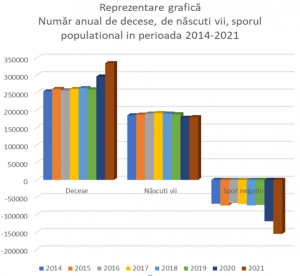 5. Analiza pe care am realizat-o capătă accente şi mai grave dacă analizăm evoluția sporului natural în acești ani (figura 7). Acest parametru reprezintă diferența dintre născuții vii şi decesele raportate într-un anumit an. Cu această ocazie am aflat că România are un spor negativ încă din 2014, adică populația acestui popor a scăzut în medie cu 70.442 anual, între 2014 şi 2019. În anii 2020 şi 2021 situația a devenit tragică, deoarece pe lângă creșterea majoră a mortalității (cauzată doar parțial de C19, după cum am arătat mai sus) a scăzut şi numărul de născuți vii. Măsurile luate au reprezentat un factor de stres major în populație, a scăzut numărul de căsătorii şi au avut astfel un impact grav asupra fertilității, natalității. După cum se poate observa din figura 7, sporul populației a fost în 2020 de minus 118.587 persoane iar în 2021 de minus 154.978 persoane. Această evoluție are toate șansele să se agraveze și, urmând panta accelerată de scădere, dacă se continuă ca până acum.