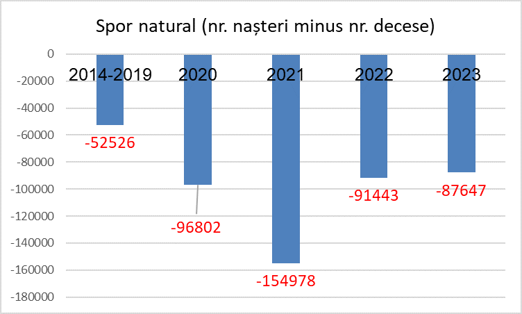 Din raportarea INS se poate calcula că sporul natural a fost în anul 2022 de minus 91.443, iar în anul 2023 de minus 87.647.