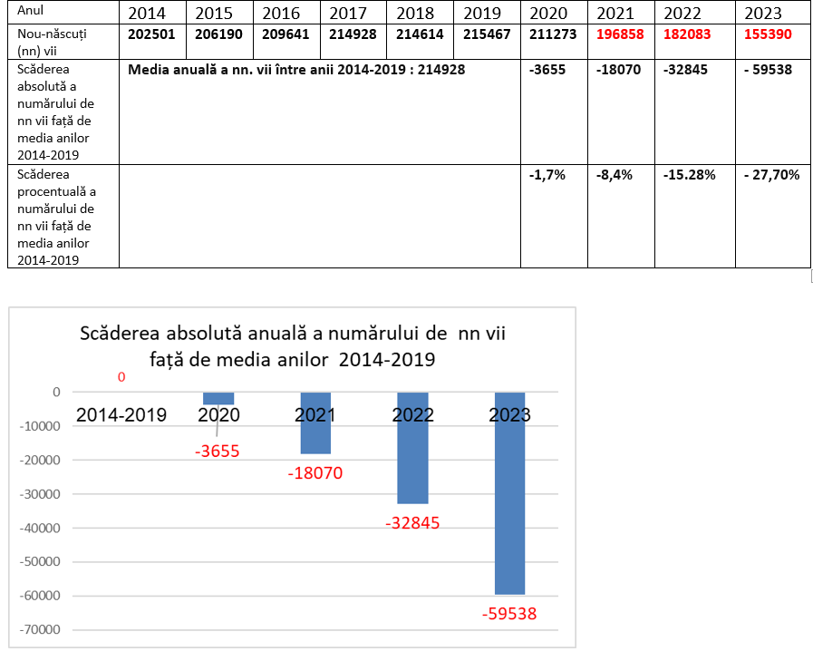 Scăderea dramatică sporului natural față de media anilor 2014-2019 este consecința scăderii alarmante a nașterilor – vezi tabelul și figura de mai jos.