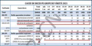 În anul 2021, procentul deceselor covid-19 în grupa de vârstă 0-35 ani a fost de 0,69% (285 din 41325) din totalul deceselor covid-19, în grupa de vârstă 0-45 ani de 2,61 % (1077 din 41325) din totalul deceselor covid-19, iar în grupa de vârstă 0-69 ani de 38,16% (15773 din 41325) din totalul deceselor covid -19.