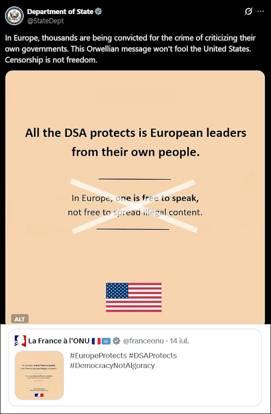 Departamentul de Stat al Administrației Trump și-a început campania împotriva cenzurii UE chiar de Ziua Franței, printr-o replică dură la un mesaj de propagandă al reprezentanței franceze la ONU de pe X, în care se spunea că „În Europa, ești liber să vorbești, nu să răspândești conținut ilegal”. În aceeași zi, Departamentul de Stat american a sancționat printr-o postare cu trimitere la contul legației franceze la ONU, în care tăia la propriu textul propagandei bruxelleze, afirmând că „Legea DSA protejează liderii europeni de propriile lor popoare” și completând cu informația că „În Europa, mii de oameni sunt condamnați pentru crima de a-și critica guvernele. Acest mesaj orwellian (al Franței – n.n.) nu va înșela Statele Unite. Cenzura nu este libertate.”