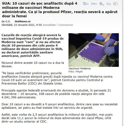Dar mass-media a ales ca această chestiune să nu existe deloc. Pentru AFP, preluat de Hotnews, există doar un număr nesemnificativ, până la urmă, de șocuri anafilactice (captura 1). Potrivit VAERS (captura 2, căutare personală), în SUA există deja 1612 decese contorizate ca fiind asociate vaccinării covid. Și alte evenimente grave.