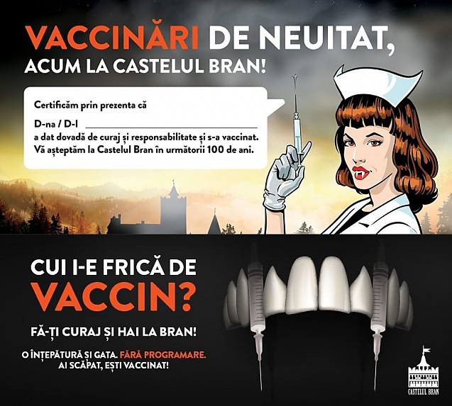 După „Maratonul Vaccinării” de la București, unde neîntâmplător s-a cântat Recviemul de Mozart, la începutul lunii mai, Ion Caramitru a anunțat redeschiderea Teatrului Național, pentru vaccinați, cu piesa „Dineu cu proști”, iar subalternii lui Florin Cîțu au anunțat promovarea vaccinării la Castelul Bran, unde ca reclamă s-a folost imaginea unei doctorițe vampiroaice cu seringi în loc de colți.