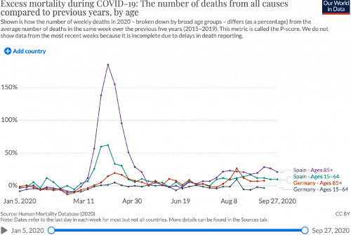 Les graphiques montrent clairement qu’il y a eu une forte surmortalité en mars et avril, puis, comme toutes les autres mesures significatives concernant le Coronavirus, elle chute de manière drastique et commence à se stabiliser, avec une légère augmentation saisonnière à l’approche de l’hiver.