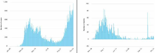 Il faut donc garder cela à l’esprit lorsque je présente le graphique ci-dessous, qui montre comment la deuxième vague du coronavirus se déroule en termes de nombre de cas par rapport au nombre de décès :