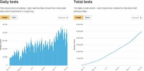 Si nous devions faire face à un dépassement du nombre de morts de la deuxième vague comme en 1918, nous le verrions dans les données. Les données ci-dessus proviennent de la province de l’Ontario, mais pratiquement tous les graphiques des endroits subissant des deuxièmes vagues en ce qui concerne le nombre de cas, se ressemblent. Le nombre de décès est en hausse (ce « pic » dans le nombre de décès était une correction de données où ils ont pris les données précédemment manquantes des 90 jours de procédure, et les ont toutes ajoutées à 2 points de données), mais le nombre de cas augmente, tout comme le nombre de tests.