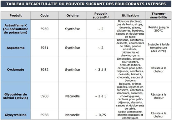 Vous trouverez ci-dessous un tableau récapitulatif des pouvoirs sucrants liés aux édulcorants intenses, classés par ordre alphabétique, de sorte à ce que vous puissiez rapidement et intelligiblement voir en quoi ces composés, naturels ou synthétiques, aident à constituer le nouveau mode d’addiction prédominant.