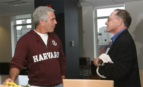 În această fotografie din 2004, Jeffrey Epstein, condamnat pentru comiterea unei infracțiuni sexuale, vorbește cu Alan Dershowitz, pe atunci profesor la Harvard, care va servi mai târziu în echipa de apărarători ai lui Epstein. Alan Morton Dershowitz (născut la 1 septembrie 1938 în Brooklyn) este un avocat american, profesor și comentator politic de origine evreiască, la fel ca Epstein.