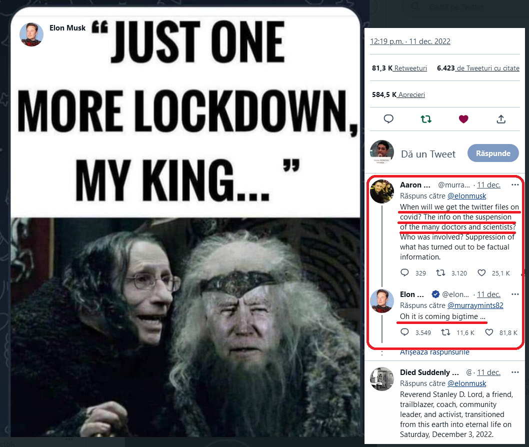 La întrebarea când vor apare Dosarele Twitter despre covid, Elon Musk a răspuns: „Vin ca o bombă.”
