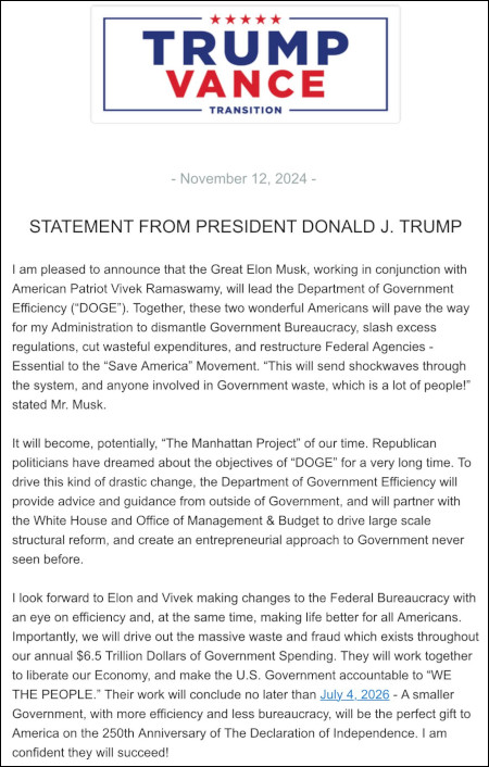 În timpul campaniei electorale, Trump a indicat comisia pentru eficiență guvernamentală propusă de el ca pe o modalitate de a reduce cheltuielile guvernamentale. „Ca prim ordin de zi, această comisie va elabora un plan de acțiune pentru a elimina complet frauda și plățile necorespunzătoare în termen de șase luni”, a declarat el în septembrie. „Aceasta va permite economisirea a trilioane de dolari”.