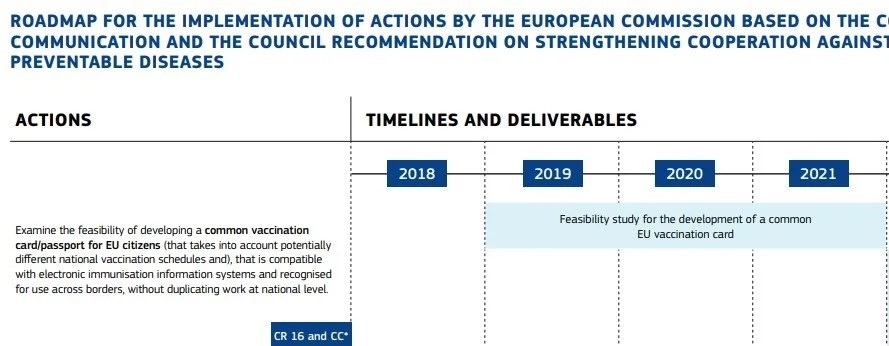 These documents were combined into the 2019 Vaccination Roadmap, which (among others) established a “feasibility study” on vaccine passports to begin in 2019 and finish in 2021: