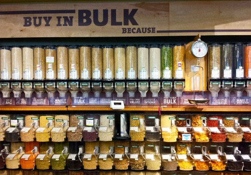 This one is a no-brainer. Bulk food stores and the bulk food section of supermarkets are almost always cheaper for beans, pasta, flours, nuts, seeds, and grains than prepackaged products. Also, if you’ve got a recipe for an unfamiliar ingredient, you can buy exactly what you need rather than risk buying an entire package that just sits in your cupboard taking up space.