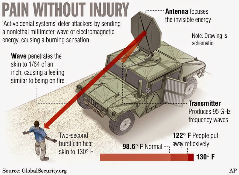 5G purportedly uses millimeter wave (MMW) frequencies, so called because the frequencies are so high (in the 24-100 GHz range). Since 1 GHz = 1 billion Hz, we are talking about frequencies with very very short wavelength (the distance between the peak of one wave and the next). The distances are so tiny they are measured in millimeters, hence the term millimeter wave. These are the exact same frequencies used by the military for their non-lethal weapons such as Active Denial Systems for crowd dispersal. These weapons have the capacity to cause tremendous injury. Dr. Paul Ben-Ishai said, “If you are unlucky enough to be standing there when it hits you, you will feel like your body is on fire.”