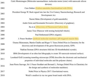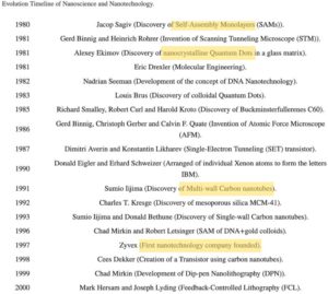 Since then there have been many discoveries in the nanotechnology space. You can view a full, year-by-year breakdown here. I have highlighted some points of particular interest that are relevant to discussions going on today. For example, “quantum dots”, “carbon nanotubules”, “fluorescent carbon dots”, and “artificial molecular machines” have been known about for decades.