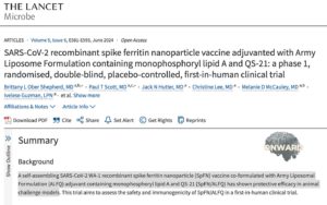 From the Lancet (2024): “A self-assembling SARS-CoV-2 WA-1 recombinant spike ferritin nanoparticle (SpFN) vaccine co-formulated with Army Liposomal Formulation (ALFQ) adjuvant containing monophosphoryl lipid A and QS-21 (SpFN/ALFQ) has shown protective efficacy in animal challenge models”.