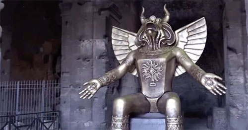 Moloch is a Canaanite god in the Old Testament that’s associated with human sacrifice, specifically the sacrifice of human children is now on display at the entrance to the Colosseum in Rome as part of a secular historical exhibition.
