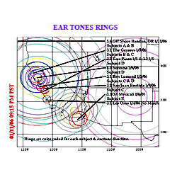 At the right [overleaf] is a recent map of ear tone rings to earthquake research plots from Petra Challus.  The circle centre represents the location of the sensitive at the time of sensing the ear tone.  The size of the circle represents the distance formula applied to the duration of tone.  The colour code of the circle represents the particular person and the tonal direction sensed by the person in the research group. All predictions are documented prior to the earthquake(s).