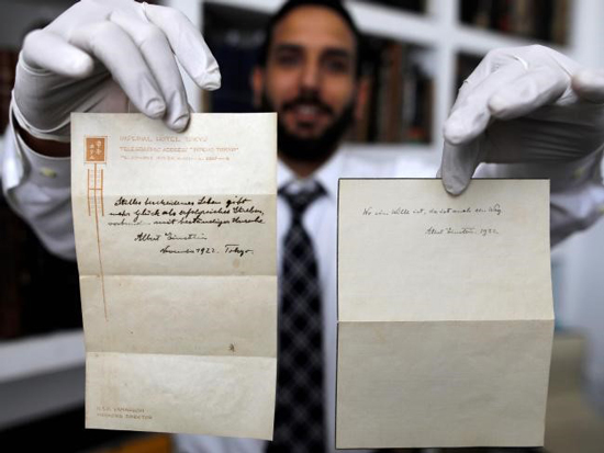 Gal Winner, owner and manager of the Winner’s Auction House in Jerusalem, displays the two notes written by Albert Einstein