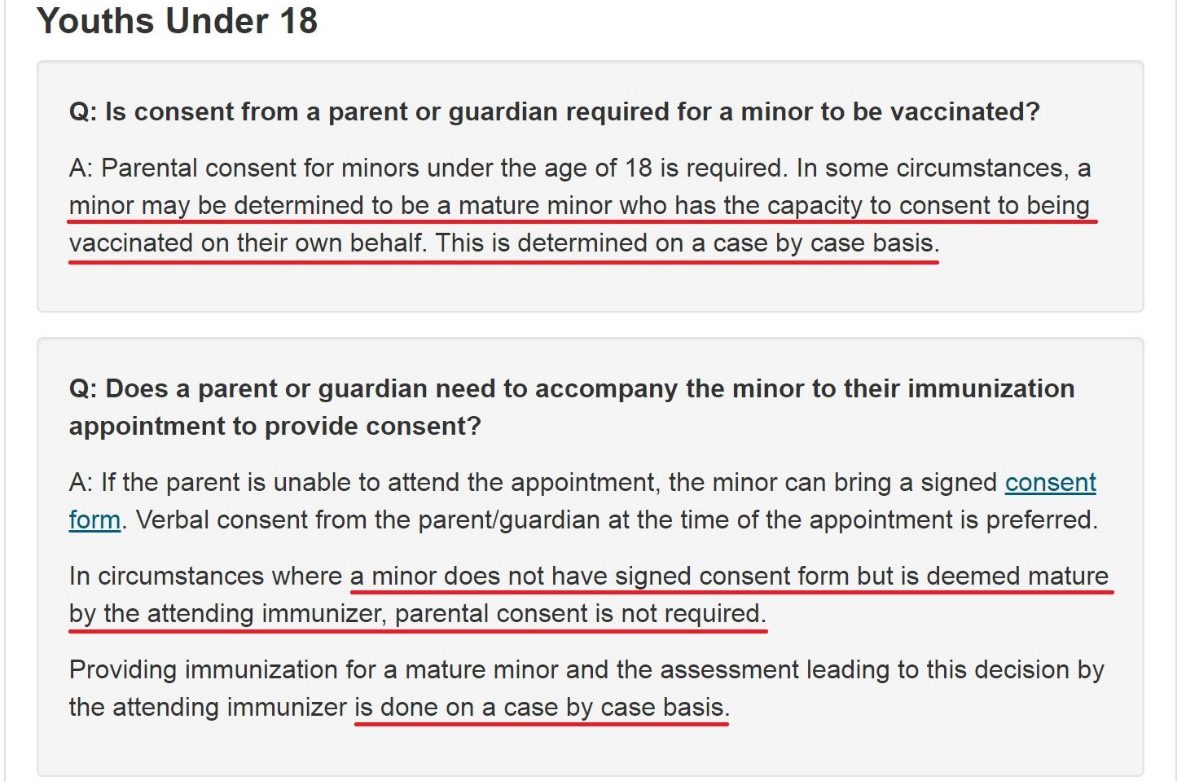 This new Alberta AHS guideline allows any of the thousands of woke, far left extremist pharma-compromised, vaccine-trigger-happy Canadian doctors to forcefully covid-19 vaccinate vulnerable children without parental consent, without any repercussions, something that recently took place in the United States as well: