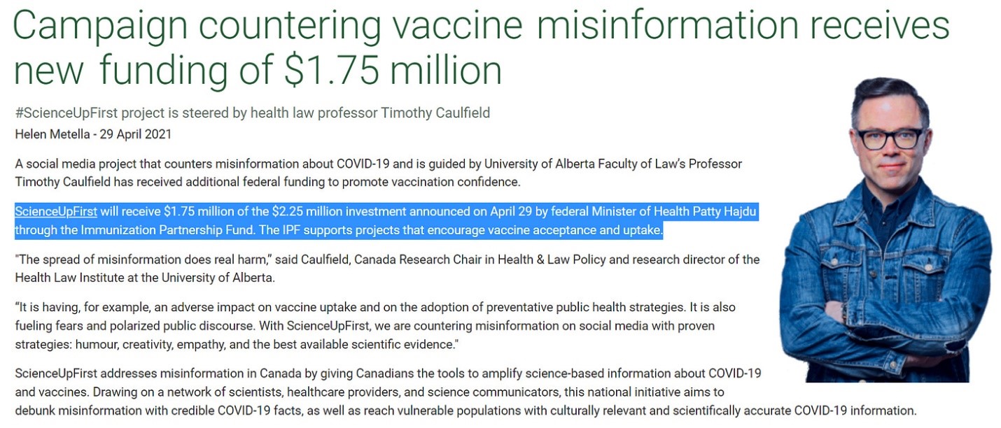 Timothy Caulfield is a Trudeau Foundation fellow, who received more than $2 million from the Trudeau Liberal government to “encourage vaccine acceptance and uptake”.