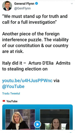 The importance of these investigations was also underlined by General Michael Flynn, a former national security adviser, who on January 5 posted a tweet in which he referred to the interview given by Maria Zack that in his opinion represents “Another piece of the foreign interference puzzle. The viability of our constitution & our country are at risk. Italy did it: Arturo D’Elia admits the stealing election on…”