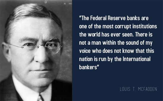 This evil institution has impoverished and ruined the people of the United States; has bankrupted itself, and has practically bankrupted our Government. It has done this through defects of the law under which it operates, through the maladministration of that law by the Federal Reserve Board and through the corrupt practices of the moneyed vultures who control it.ˮ – Louis T. McFadden, June 10, 1932