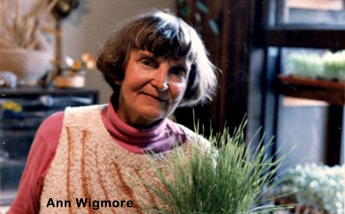 Ann founded the Hippocrates Health Institute and the Ann Wigmore Natural Health Institute which use wheatgrass as the foundation of their cancer programs. Ann lectured on her ideas in the US, Canada, and Europe. Healthy at age 96, Ann died in 1994 from smoke inhalation in a fire.