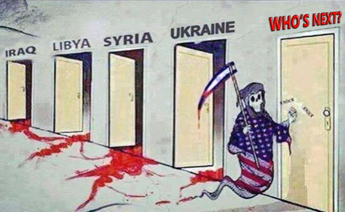 US organized and funded regime changes, led by terrorist proxies in the Ukraine, or direct invasion in Iraq, Libya and Syria, and the NATO encirclement of Russian borders and economic sanctions rely on fear mongering. The message is: “We must bomb them first or they (Russia, China, Syria, Iran… fill-in-the-blank) will launch a sneak attack on us.”