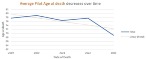 The data also shows the average age of pilot deaths is decreasing over time: