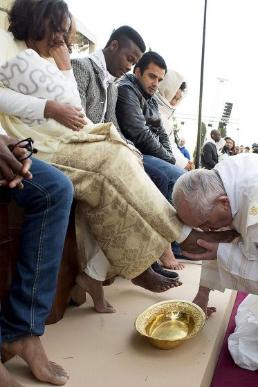 Pope Francis kisses the foot of a refugee during the foot-washing ritual at the Castelnuovo di Porto refugees center near Rome, Italy, March 24, 2016.
