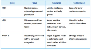 To put it simply, an Unhealthy Plant-Based Diet Index (uPDI) refers to a plant-based diet that includes mostly low-quality plant foods that are heavily processed or high in added sugars and refined carbs. While these foods technically come from plants, they don’t offer the same health benefits as whole, nutrient-rich plant foods.