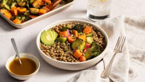 Lunch – Lentil and vegetable bowl (carrots, squash, and greens) tossed in coconut oil, and served with sourdough bread. Sprinkle with fresh herbs for added flavour and colour.
