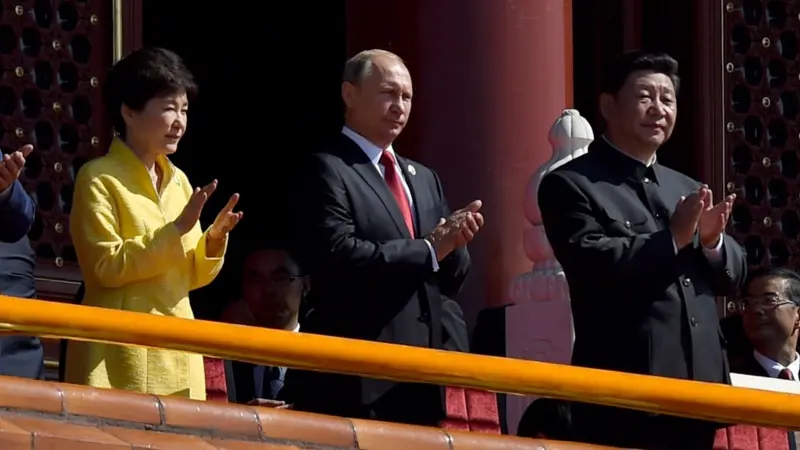 There it was South Korea’s then President Park Geun-hye who stood shoulder to shoulder with President Xi and President Putin. Kim Jong Un was absent. North Korea sent a party official in his place.