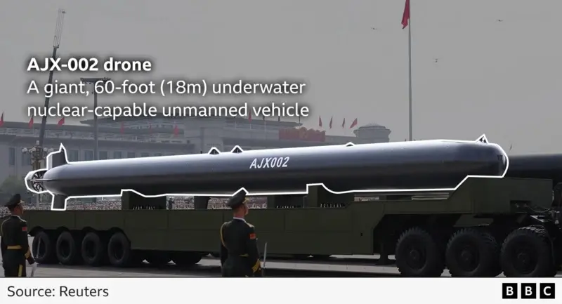 BBC analysts say: “We saw a lot of drones – some of them AI-powered – at the parade in various forms. The one that grabbed eyeballs the most was the AJX-002 giant submarine drone that measures up to 20m in length.”