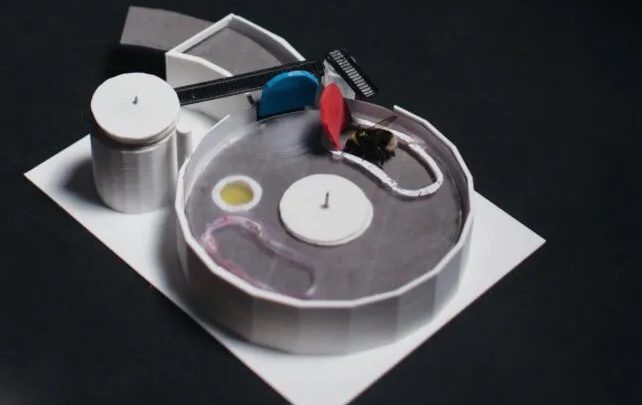 In the image below, you can see the puzzle. The yellow circle contains a drop of sugar under a plastic lid. Bees can get to it by pushing the red tab, but only once the blue tab has been pushed out of the way.