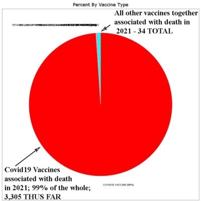 In May 2021, that first study was published after peer review confirmed the findings: “99% of the associated deaths from vaccination in all of 2021 have come from one vaccine alone (covid), with the more than 100 vaccines in actual use all combined together being associated with just one percent.”