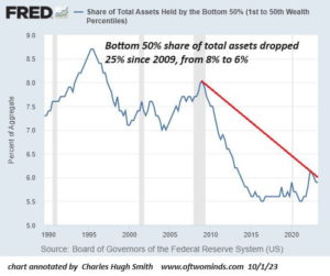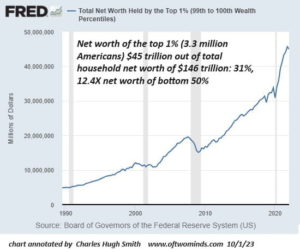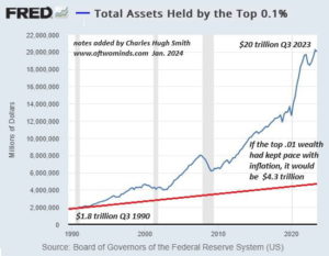 “The near-zero rate credit was distributed asymmetrically; only the wealthiest few had access to the open spigot of ‘free money,’” explains analyst Charles Hugh Smith. The rest of us were “paying much higher rates of interest than corporations, banks and financiers,” he says.