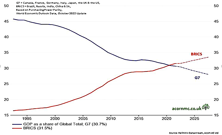 This kind of miscalculation has permeated Western thinking about the global economy and the respective roles played by the G7 and BRICS. In October 2022, the IMF published its annual World Economic Outlook (WEO), with a focus on traditional GDP calculations. Mainstream economic analysts, accordingly, were comforted that — despite the political challenge put forward by BRICS in the summer of 2022 — the IMF was calculating that the G7 still held strong as the leading global economic bloc.